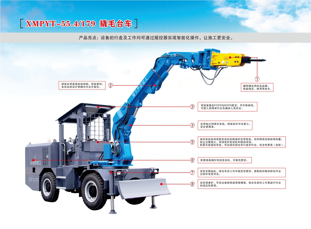 性能特點: XMPYT-55.4/179 撬毛臺車(che)采(cai)用電控系(xi)(xi)統(tong)讀取(qu)發(fa)動機(ji)的轉速和負(fu)荷信息,實(shi)時精準控制(zhi)油泵排量,防止過載(zai)熄火,有效保護發(fa)動機(ji)和驅動系(xi)(xi)統(tong)。 配置(zhi)無線遙控系(xi)(xi)統(tong),可(ke)遠(yuan)程實(shi)現(xian)臺車(che)行走和作業,安全性更高。